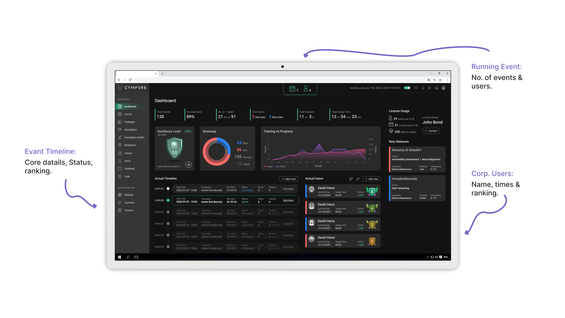 A screen showing the company events currently running in the system. The members of the company's cyber team play on a separate platform - the event is a game that takes X time, in which they solve cyber problems. The screen shown here is the side of the team leader, who oversees and manages the events.